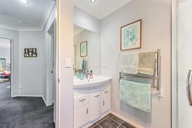 Accommodation is generous, with 4 spacious bedrooms across 2 levels. The master suite is a private retreat, complete with a walk-in robe, ceiling fan, heat pump, and a luxurious ensuite featuring a new bath, double vanities, and quality fittings. Additional bedrooms are well-sized with excellent storage, and guests are well catered for with stylish bathrooms on both levels.